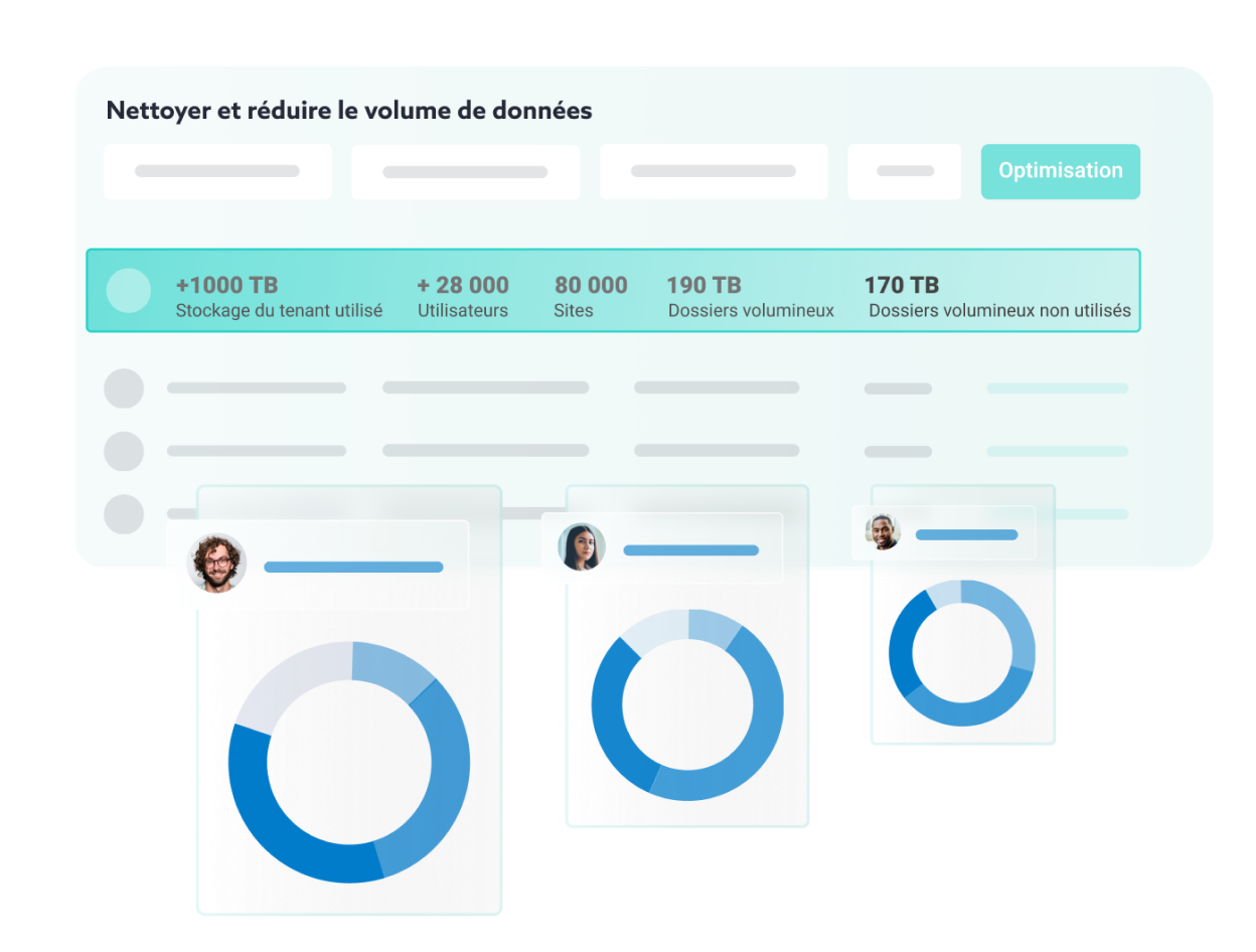 - Identification des fichiers volumineux, qui ne sont plus accédés, des espaces inactifs, des groupes et des sites SharePoint inutilisés, des utilisateurs propriétaires de fichiers lourds (par type),